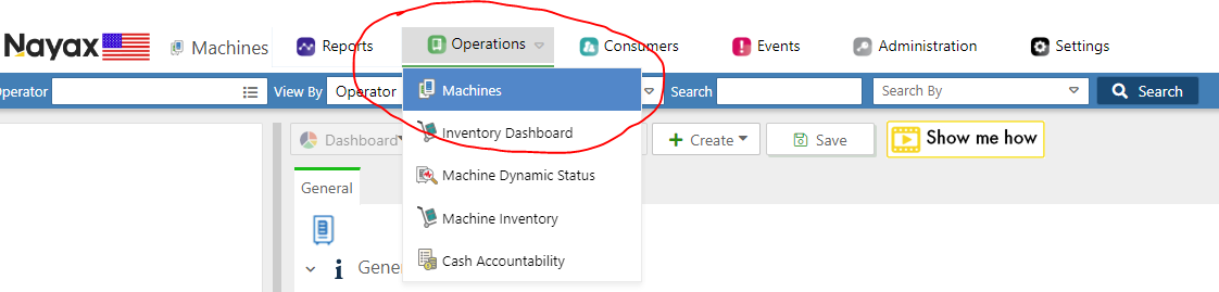 Step 1: Log into your my.nayax.com dashboard. Go to the “Operations” tab and select, “Machines”.