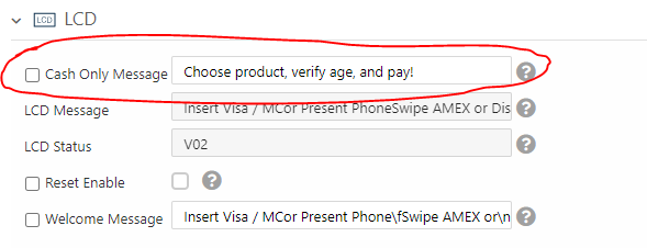 Step 8: Scroll down to the “LCD”. Edit the “Cash Only Message”